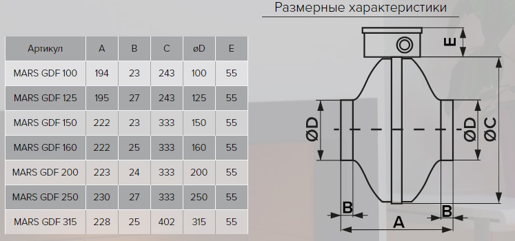 Вентиляторы c диаметром патрубка 100 мм., 125 мм., 150 мм., 160 мм., 200 мм. оснащены рабочим колесом с пластиковыми лопатками. Вентиляторы с диаметром патрубка 250 мм., 315 мм. оснащены рабочим колесом с металлическими лопатками.