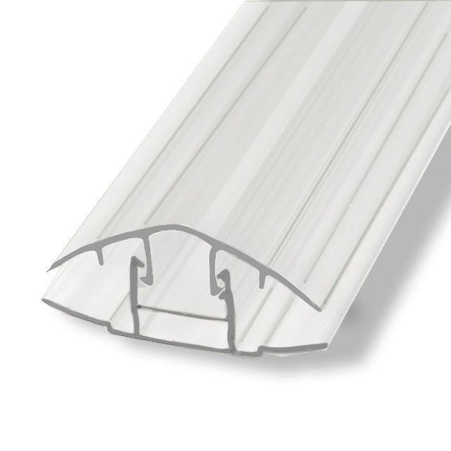 Разъемный стыковочный профиль состоит из базы-основания и специальной крышки, которые соединяются друг с другом при помощи особого «замка». Такой профиль более удобен в работе, чем неразъемный. Сначала к основанию крепится база, а затем – верхняя крышка. Профиль со стороны сечения представляет собой перевернутую букву Н. Между двумя пластиковыми планками, соединенными посередине, образуются две полости, в которых и крепятся листы материала. У профиля есть специальная камера, где просверливаются отверстия для крепежных элементов – саморезов, болтов.
