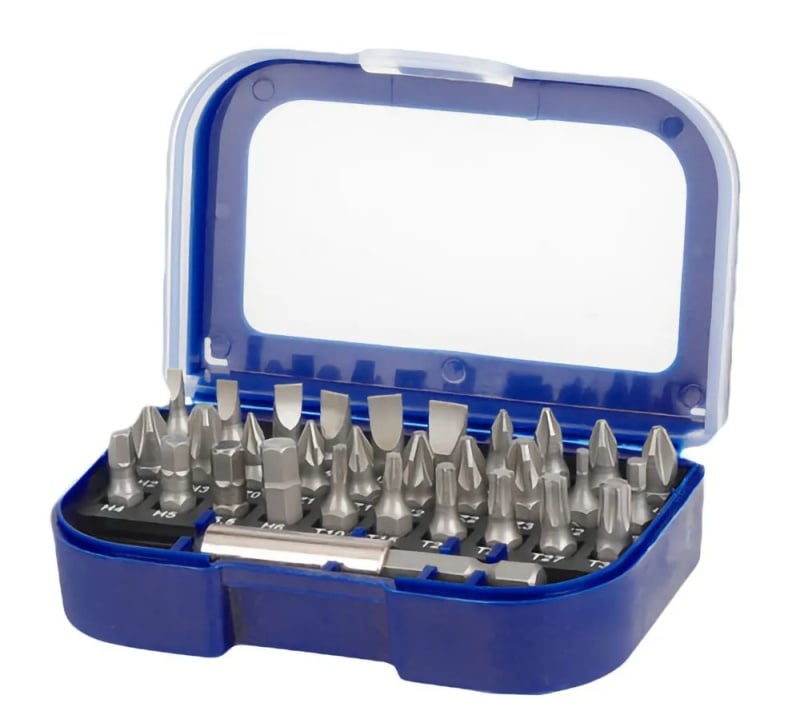 В наборе хром-ванадиевые магнитные биты 30шт 25мм: SL3, 4, 5, 5.5, 6, 7мм; PH0, PH1x2, PH2x2, PH3; PZ0, PZ1x2, PZ2x2, PZ3; T10, T15, T20, T25, T27, T30, T40; H2, H2.5, H3, H4, H5, H5.5, H6