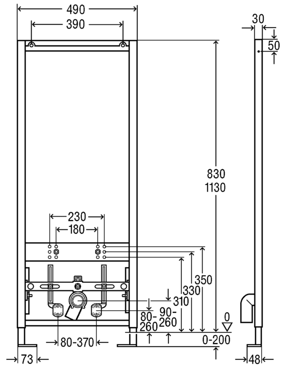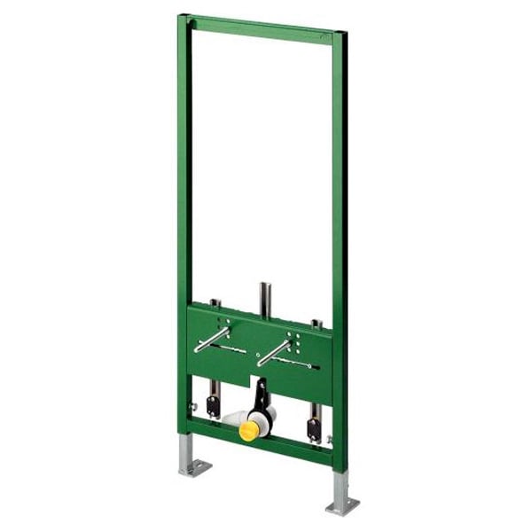 стальная рама с порошковым напылением, регулируемый по высоте и звукоизолированный крепеж для водорозеток Viega, регулируемое по высоте сливное колено DN40/DN50, резиновый ниппель DN40/30, крепежный материал для модуля (к полу) и керамики, саморезы для фиксации на металлических каркасных конструкциях, отверстие Ø 11 мм для крепления на деревянном каркасе, выдвижные опоры