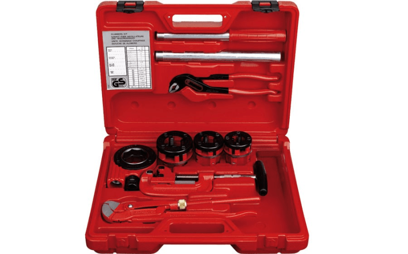 Сантехнический набор с резьбонарезными головками до 1”, трещоткой, труборезом до 1.1/4”, с газовым ключом 1” и сантехническими клещами.