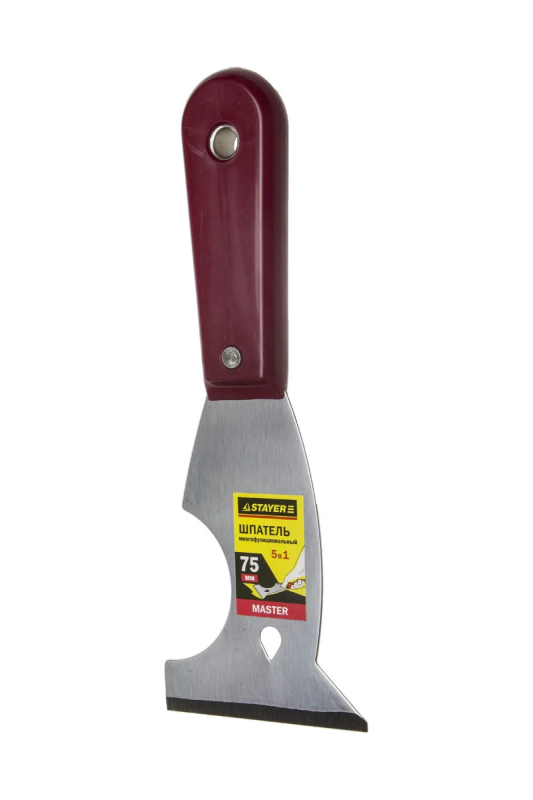 Рукоять многофункционального шпателя с пластмассовой ручкой STAYER 10031 из ударопрочного пластика отличается прочностью, а также обеспечивает надежный захват.