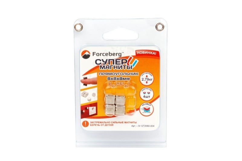 В идеальных условиях сила сцепления одного магнитного кубика 8х8х8 мм достигает 2,79 кг. Это вполне достаточно, чтобы удержать не очень тяжелый инструмент или подвесить на холодильник календарь. Под идеальными условиями понимают отрыв магнита от чистой и гладкой стальной плиты толщиной не менее 10 мм под углом 90 градусов.