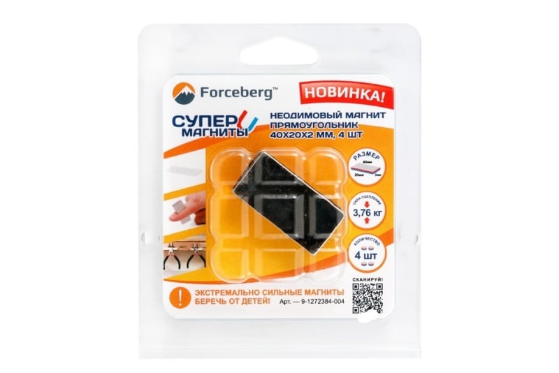 Один неодимовый магнит прямоугольной формы 40х20х2 мм при сравнительно небольшом собственном весе (12 г) удержит до 3,76 кг (до 1,88 кг при использовании на сдвиг). Легко и надёжно приклеивается к практически любым поверхностям суперклеем.