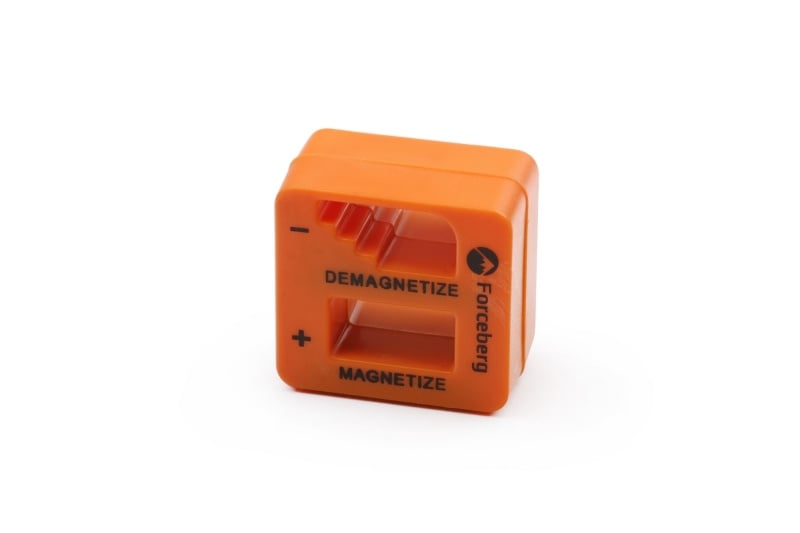Устройство предназначено для намагничивания или размагничивания небольших инструментов. Сильные магниты в нижней части устройства (magnetize) намагнитят отвертки, гаечные ключи, пинцеты, ножницы. Чтобы размагнитить инструмент, надо провести им по верхней части с надписью demagnetize.