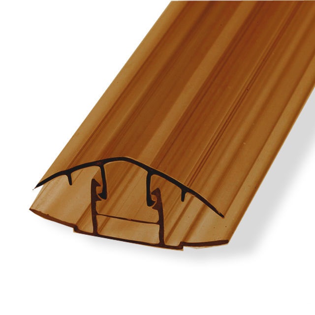 Разъемный стыковочный профиль состоит из базы-основания и специальной крышки, которые соединяются друг с другом при помощи особого «замка». Такой профиль более удобен в работе, чем неразъемный. Сначала к основанию крепится база, а затем – верхняя крышка. Профиль со стороны сечения представляет собой перевернутую букву Н. Между двумя пластиковыми планками, соединенными посередине, образуются две полости, в которых и крепятся листы материала. У профиля есть специальная камера, где просверливаются отверстия для крепежных элементов – саморезов, болтов.