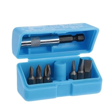 В комплект поставки входит адаптер и следующие размеры бит: PH0, PH1, PH2, SL3, SL5, SL7