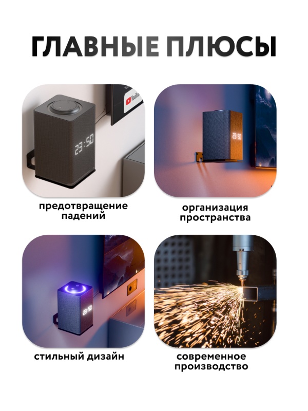 Элегантный чёрный держатель выполнен из прочного металла, обеспечивая долговечность и надёжную фиксацию даже крупногабаритных колонок. Компактная форма позволяет легко разместить устройство на столе, полке или стенде, освобождая рабочее место от хаоса проводов.