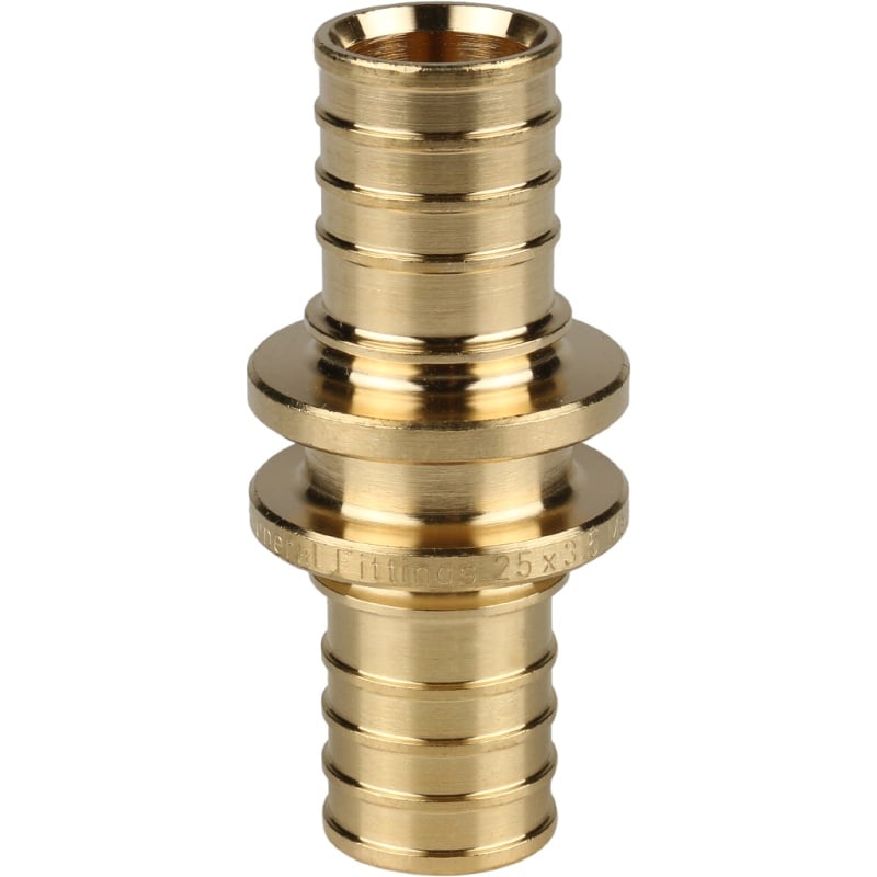 Муфта соединительная равнопроходная Stout имеет два штуцера равного диаметра, которые вставляются в трубы из сшитого полиэтилена Stout для создания максимально прочных неразъёмных соединений. Соединительный элемент оснащён упорным буртиком, предотвращающим осевое перемещение трубы относительно фитинга при напрессовке гильзы. Материал изготовления – латунь марки CW617N, которая допускается для использования в системах питьевого водоснабжения.