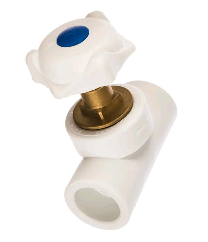Корпус изготовлен из рандом сополимера полипропилена - специального пластика, рассчитанного на длительную работу под давлением при повышенных температурах. Запирающий элемент и шток - из стойкой к обесцениванию латуни CW617N.