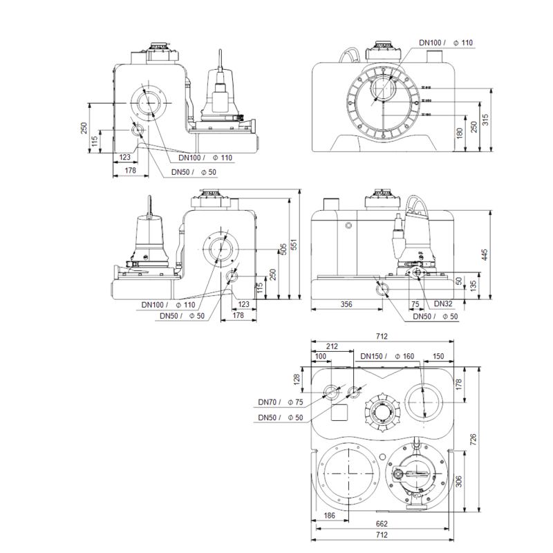 Станция сконструирована на базе насоса Grundfos с полуоткрытым рабочим колесом Vortex. Задание режимов работы осуществляется при помощи микроконтроллерной станции управления LC 221.1. Длина кабеля электродвигателя 10 м, длина кабеля шкафа управления со штекером 1,5 м. Реле уровня – пневматическая труба, установленная в накопительном резервуаре и соединенная 10-м шлангом с пьезорезистивным датчиком в шкафу управления. Multilift на подвержен коррозии, а также герметичный и осадок на дне минимальный.