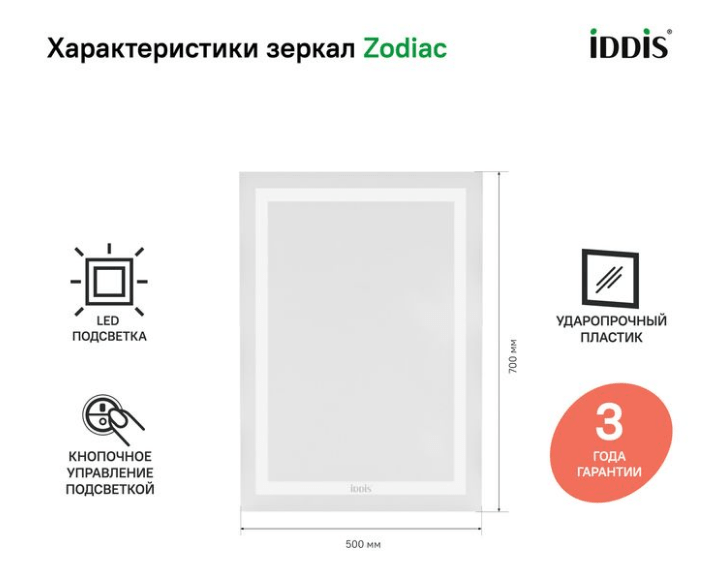 • На зеркальной поверхности не остается отпечатков пальцев благодаря механическому управлению светодиодной подсветкой. Выключатель спрятан на торце зеркала и невидим взгляду – активировать освещение можно простым нажатием на кнопку.