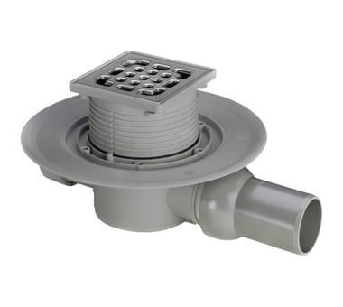 поворотная и регулируемая по высоте насадка 100x100 мм, рамка для установки решетки сделана из пластика, заглушка, штампованная решетка из нержавеющей стали 1.4301, фланец для нанесения/закрепления гидроизоляции, съемное устройство для защиты от неприятного запаха из системы канализации, ввод для подключения дополнительных сантехприборов DN40, выпуск на шарнирном соединении