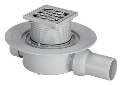 поворотная и регулируемая по высоте насадка 100x100 мм, заглушка, штампованная решетка из нержавеющей стали 1.4301, фланец для нанесения/закрепления гидроизоляции, съемное устройство для защиты от неприятного запаха из системы канализации, ввод для подключения дополнительных сантехприборов DN40, выпуск на шарнирном соединении
