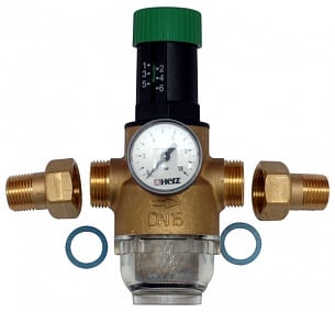 Компактное исполнение, корпус из латуни, соединительные патрубки с наружной резьбой с конусом DN 15 и DN 20.