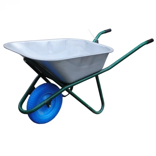 Тачка имеет одно литое колесо, оцинкованный кузов на 110 литров и раму выполненную из полых труб. Грузоподъемность тачки составляет 250 кг.