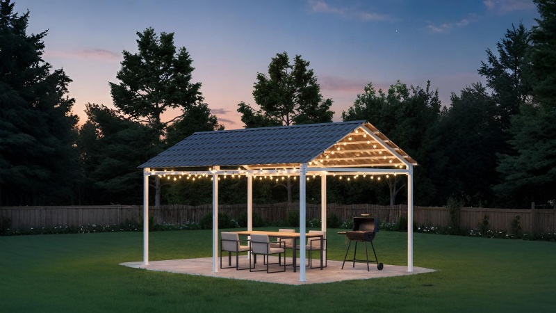 - Мягкая кровля: придаст беседке элегантный вид и обеспечит тишину в дождливую погоду.